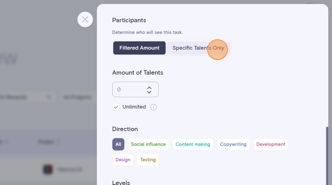 The following section defines target talents to which the task will be open. You can dedicate task to specific talents only, otherwise the task will be visible to all talents that pass the conditions set. It is possible set a maximum amount of talents for this task or pick talents with specific specialization (skillset). Finally, if you have connected a Discord server to your project, the task can be available only to users with a particular Discord role.
