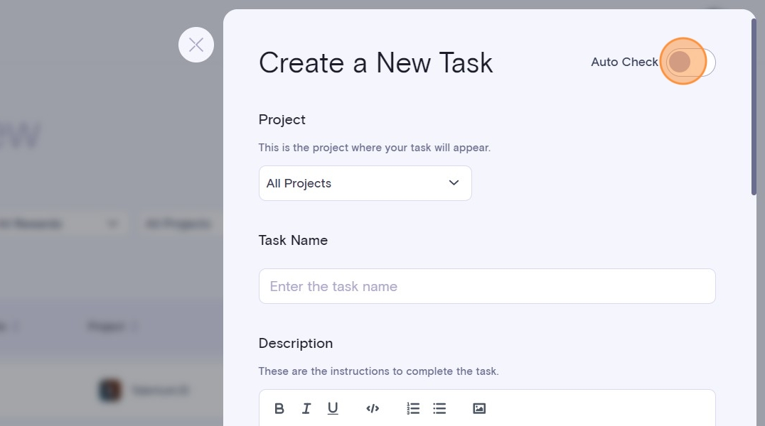For regular tasks, use the Auto-Check toggle to choose whether the task will be approved automatically or will require a review from your team.