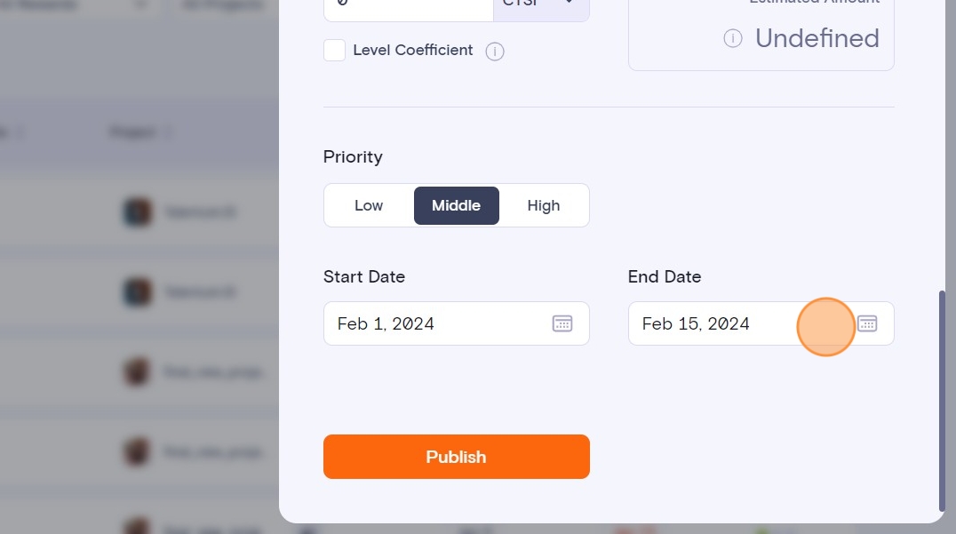 Finally, set the task's priority and the time period. The priority does not influence any operational parameters of the task and is used by talents as filter in the database. The Start and End dates, on contrary, are very important as they define when the task will be available for completion. Note that you can set a starting date significantly later in time.