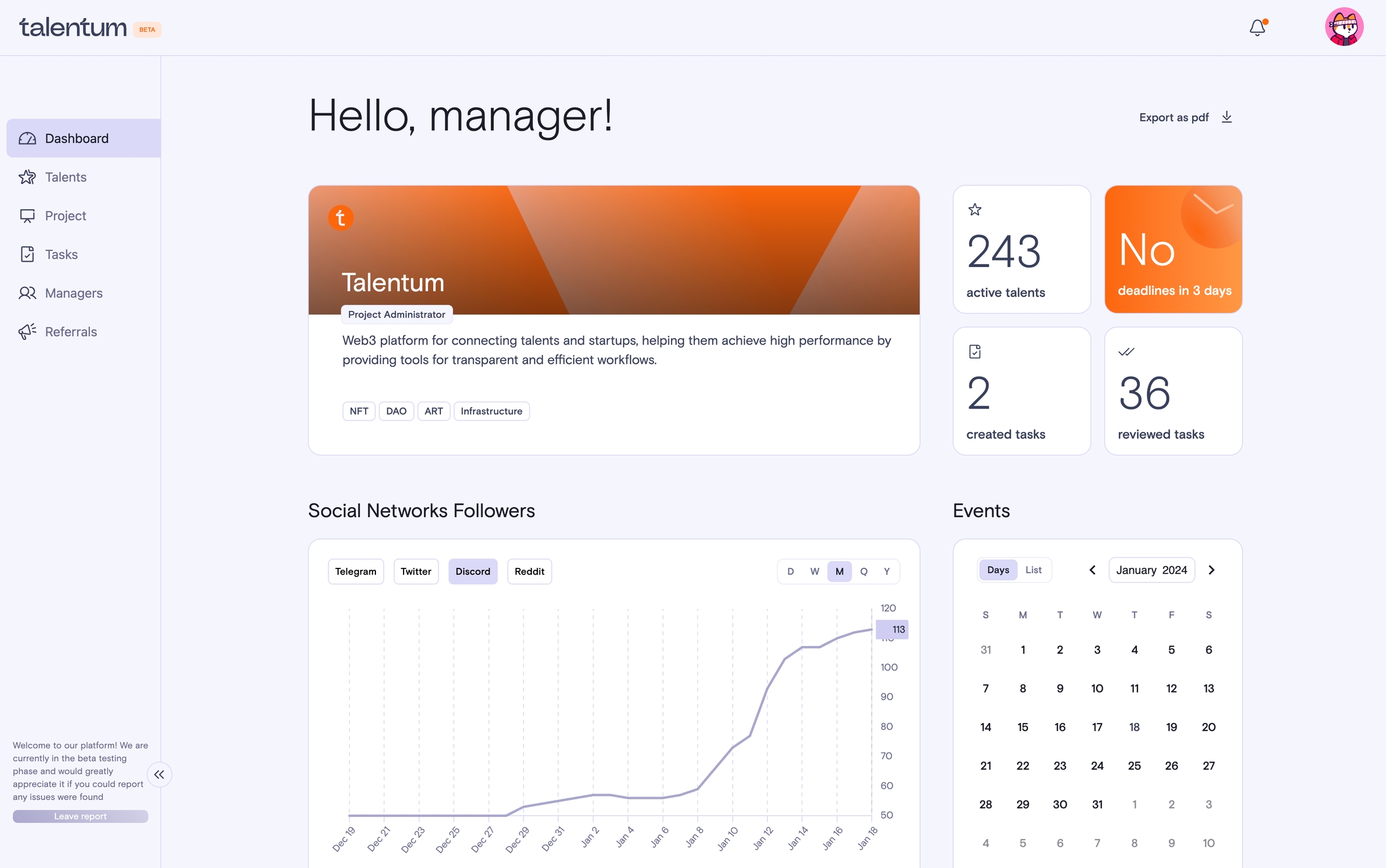 On the user dashboard, talents can see the projects they have joined, as well as ongoing and completed tasks. Another widget displays upcoming events, which can be viewed as a calendar or a list.