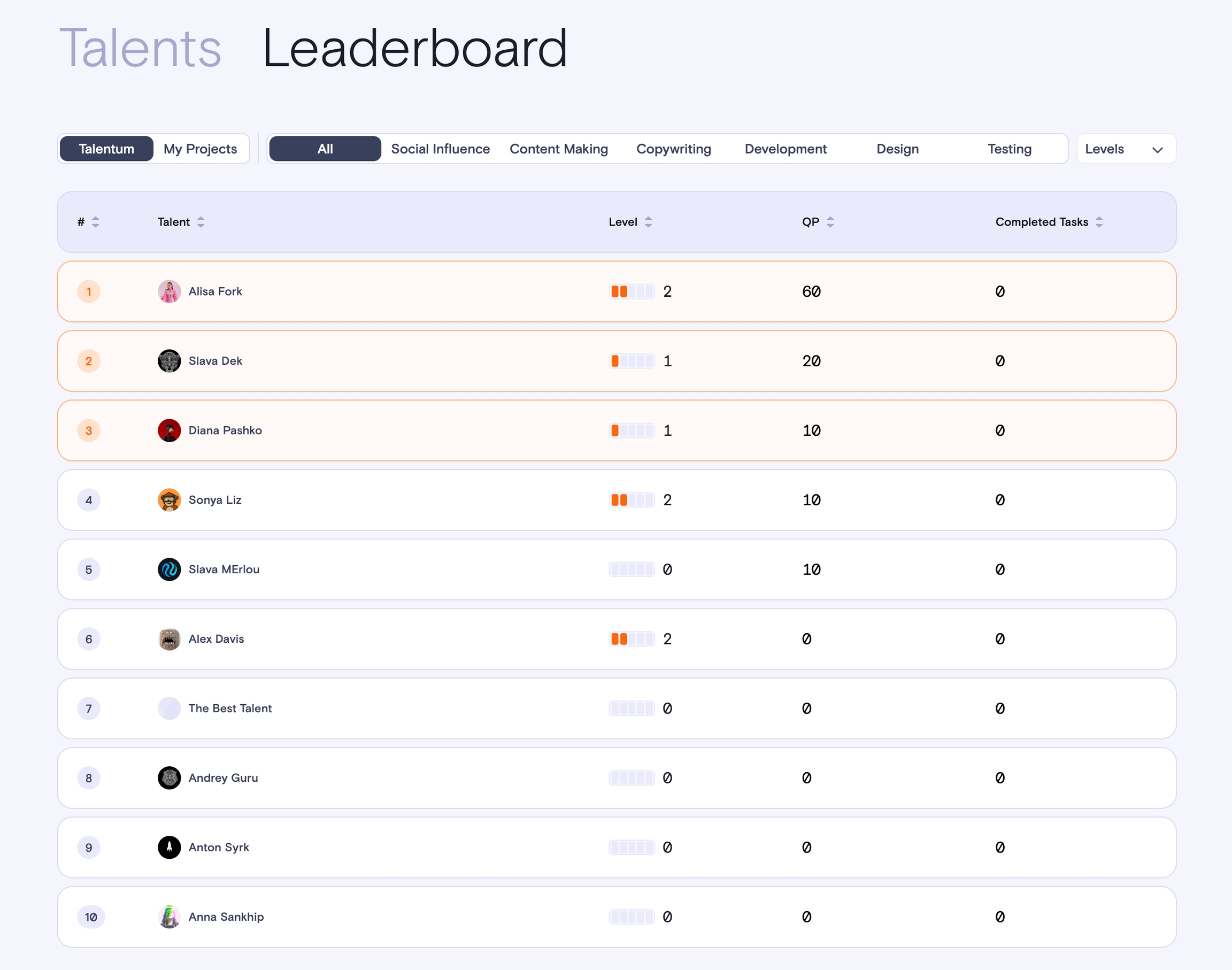 Leaderboard is created to motivate talents to enhance their expertise in a chosen specialization or increase the value for a selected project. Project teams can use the leaderboard to identify top talents with proven expertise in a specific specialization and assign them complex tasks.