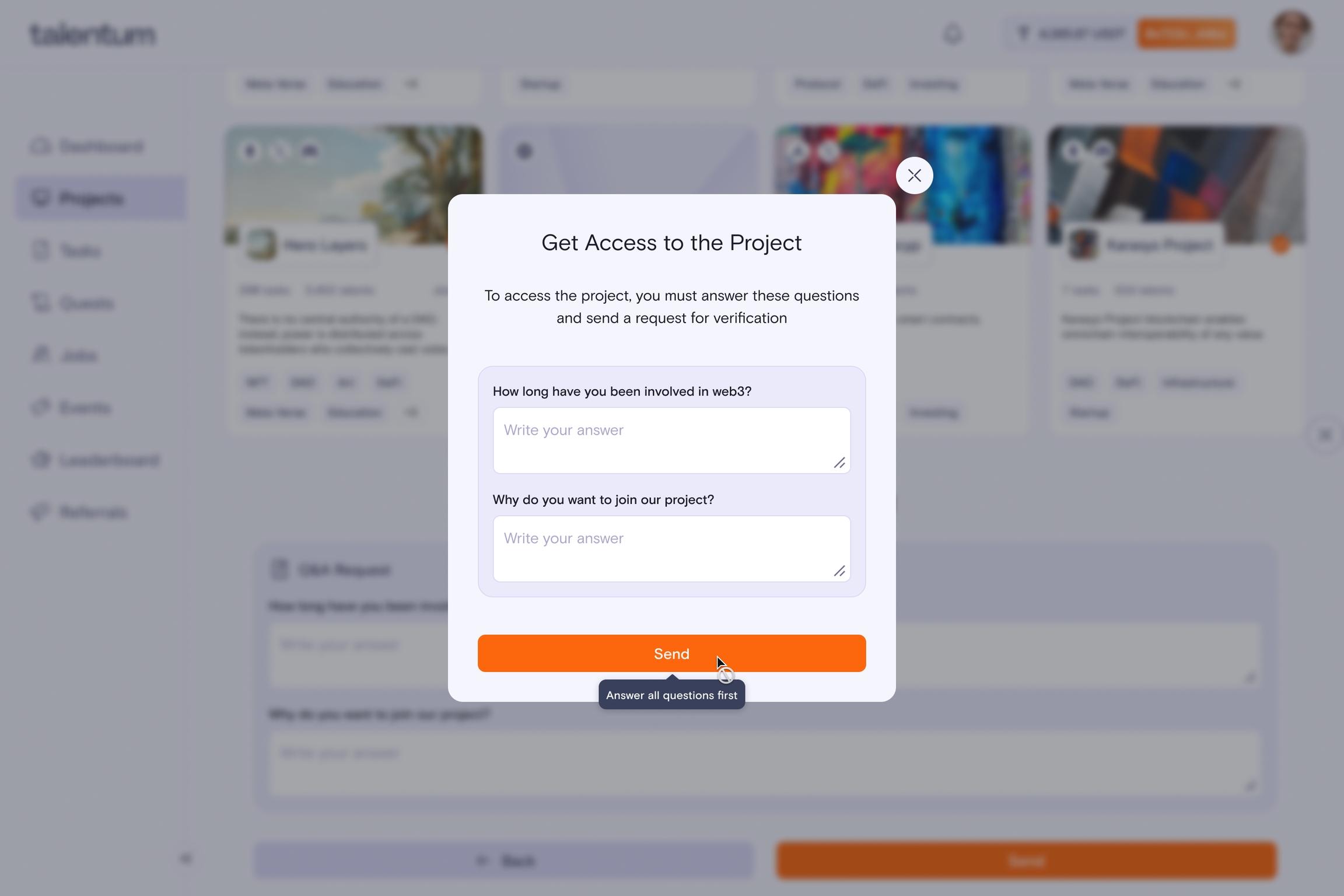 All requests to join the project with answers from talents can be found in the Q&A gate tab on the Requests page. Project teams can analyze talents' answers and other available information to accept or reject their submissions.